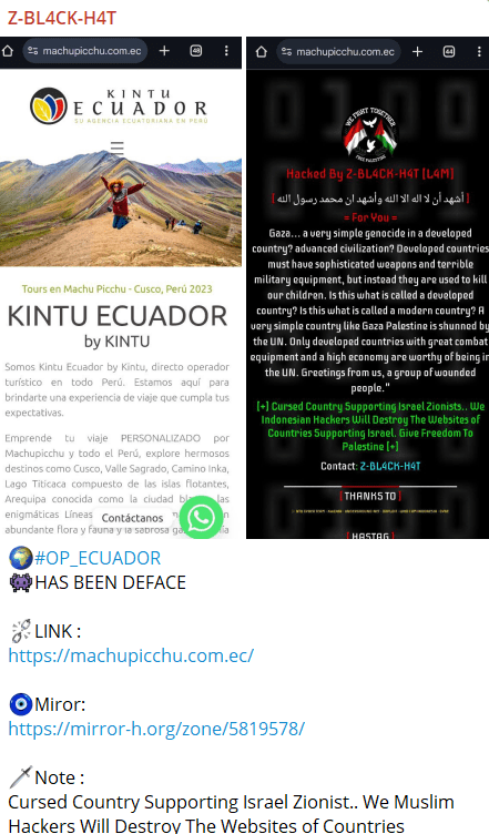 El 14 de enero de 2025, el grupo identificado como Z-BL4CK-H4T afirmó haber desfigurado (defaced) el sitio web oficial de Machu Picchu Travel, una agencia turística con dominio .com.ec, lo que indica presencia en Ecuador.
